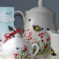 Just using my favorite Honey Bee set! I found this plain tea set at a warehouse store and paid $6 for all three pieces. I then used PTI inks and heat set them, finally making a card to match....